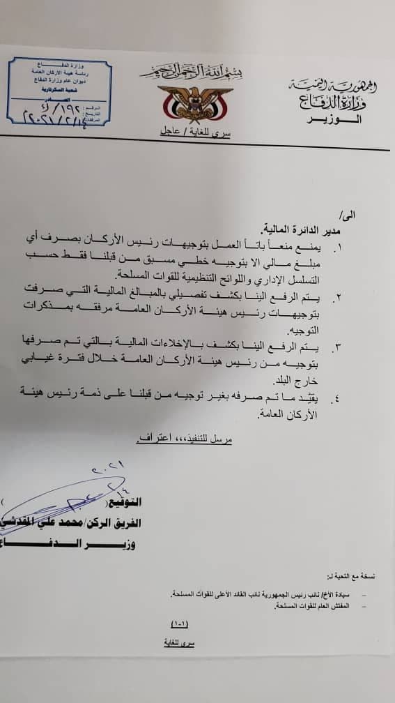 وكشفت وثائق حصل عليها الخبر اليمني توجيهات المقدشي لرؤوساء الدوائر والهيئات في وزارة الدفاع بعدم التعامل مع أي أوامر صادرة من بن عزيز، وكذلك بعدم صرف أي مبلغ يوجه به بن عزيز، وأن لا يتم الصرف إلا بأوامر خطية من وزير الدفاع.