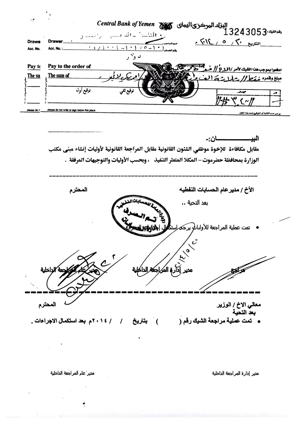 1. أمر بصرف مبلغ 97.150 دولار لدفع مكافآت لقيادة الوزارة وعدد من الموظفين نظير تحصيل مبلغ مستحق للدولة.