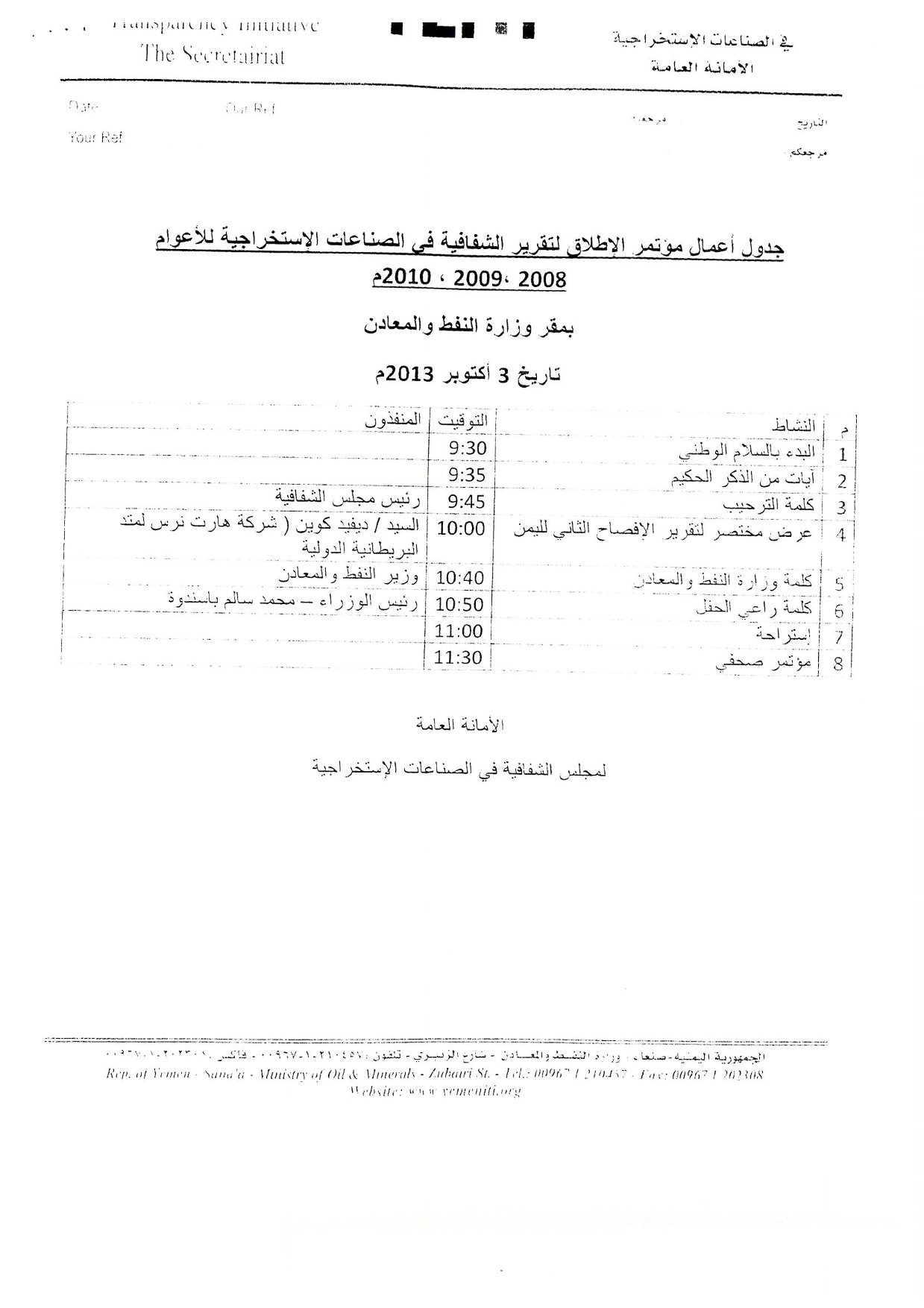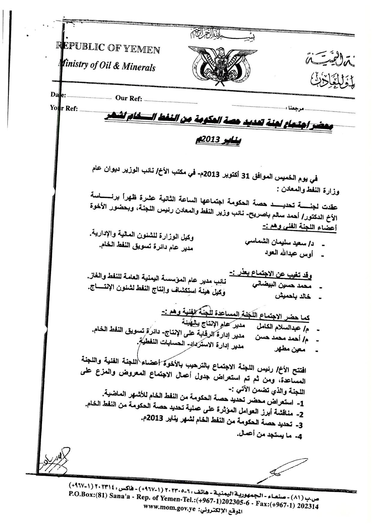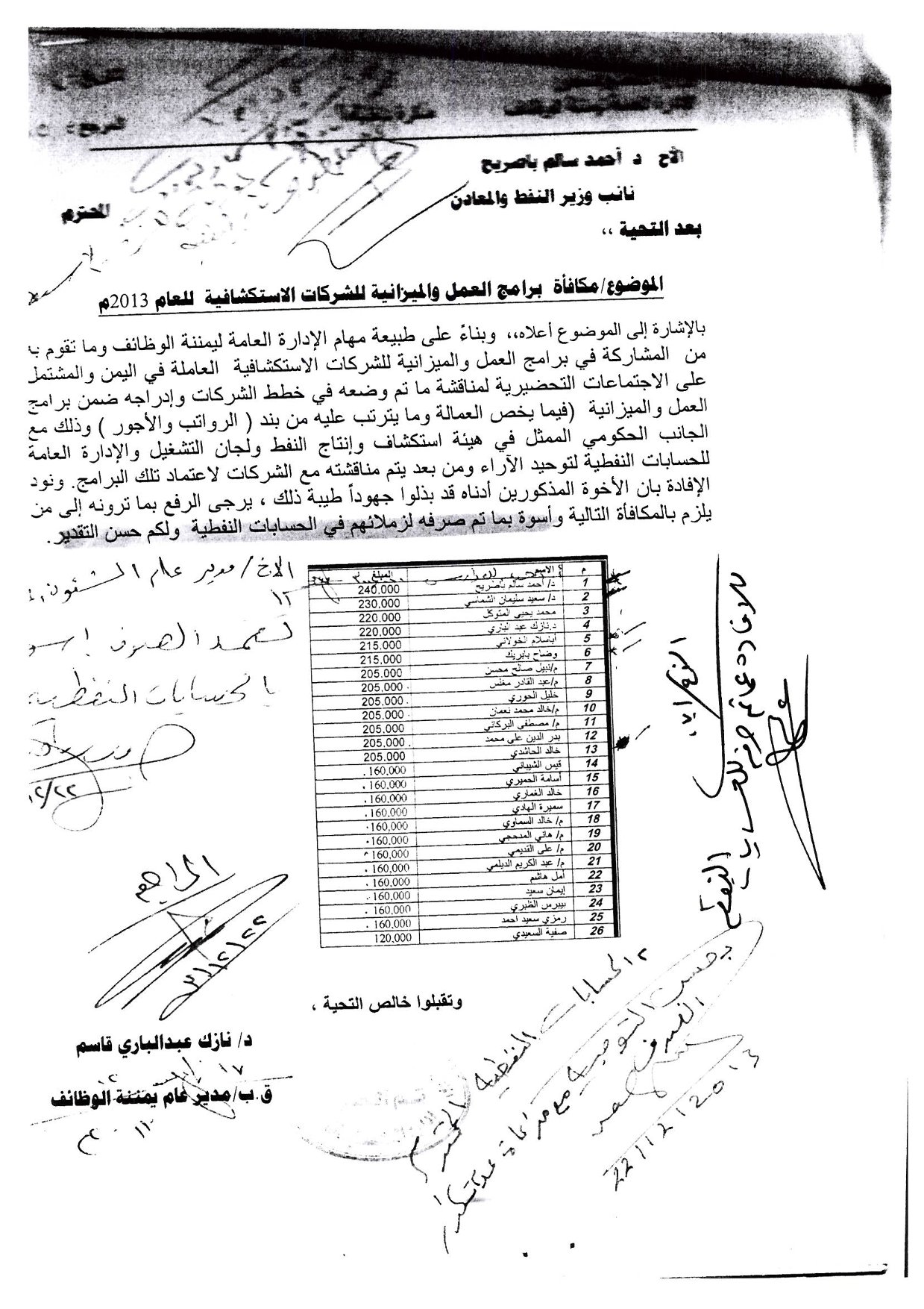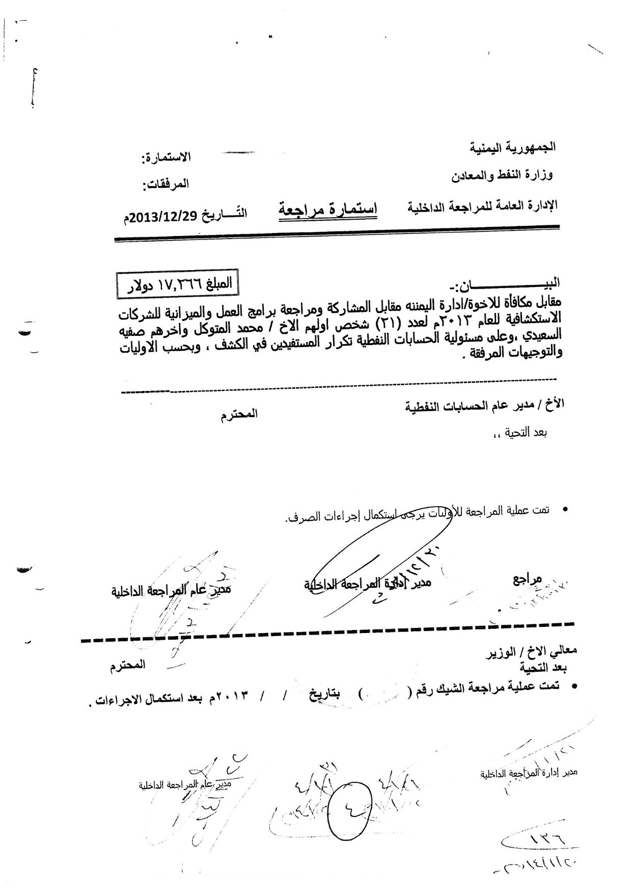 1. أمر صرف مبلغ 17.266 دولار لإدار اليمننة لدفع مكافآت مقابل المشاركة في مراجعة برامج الشركات الاستكشافية لعام 2013م.