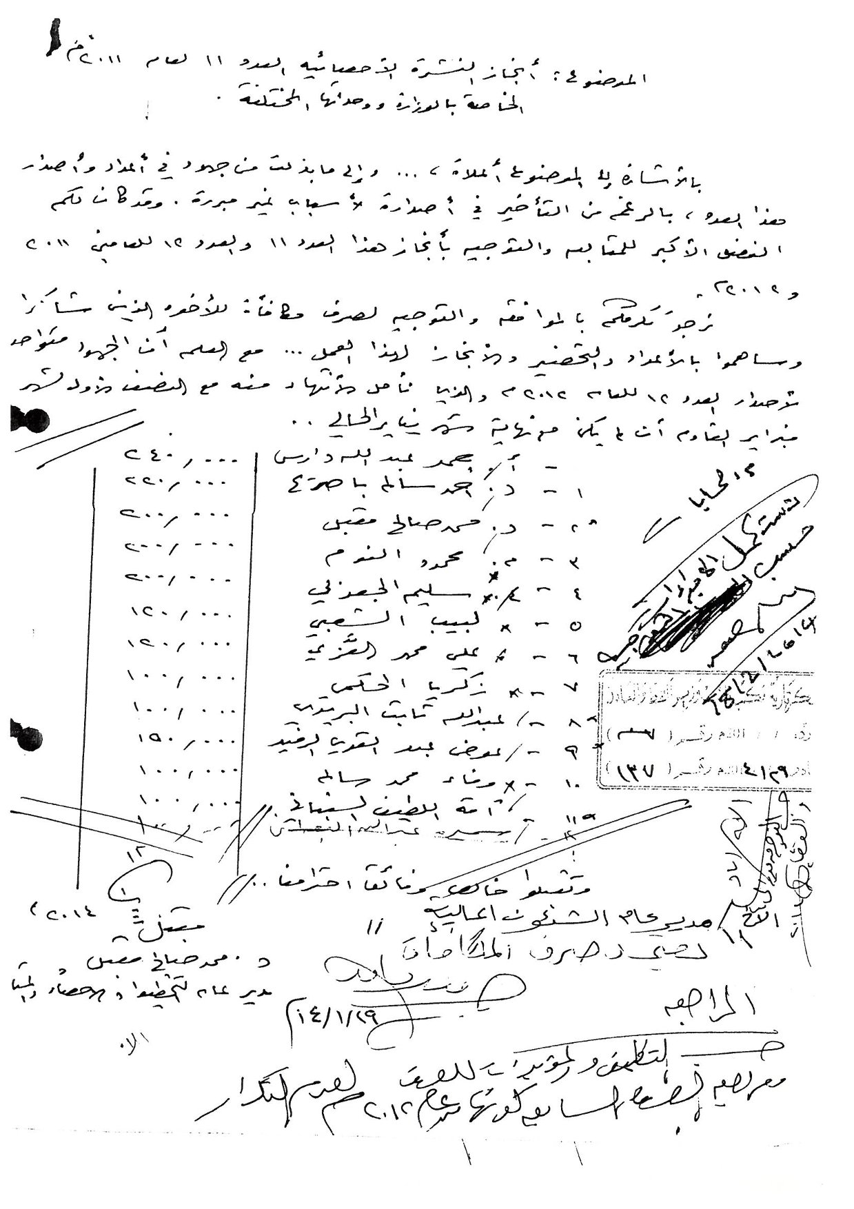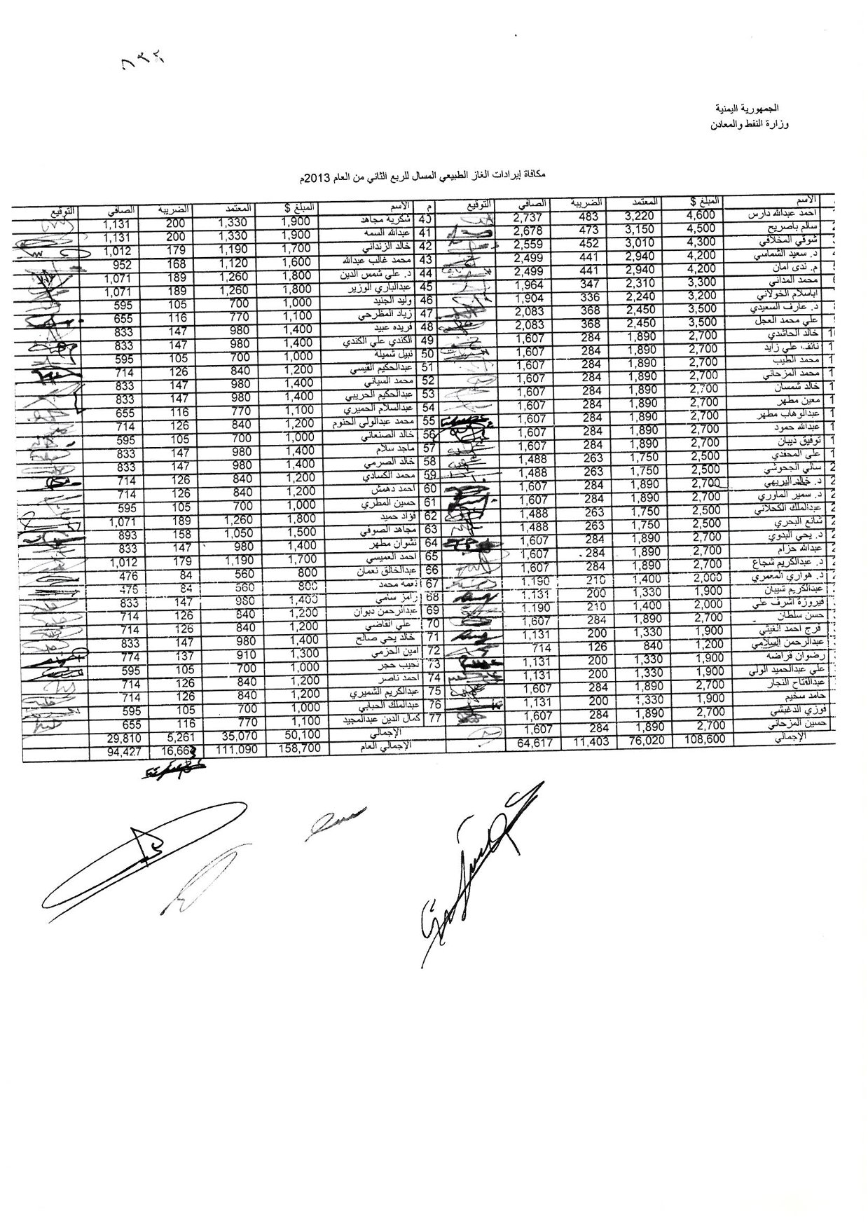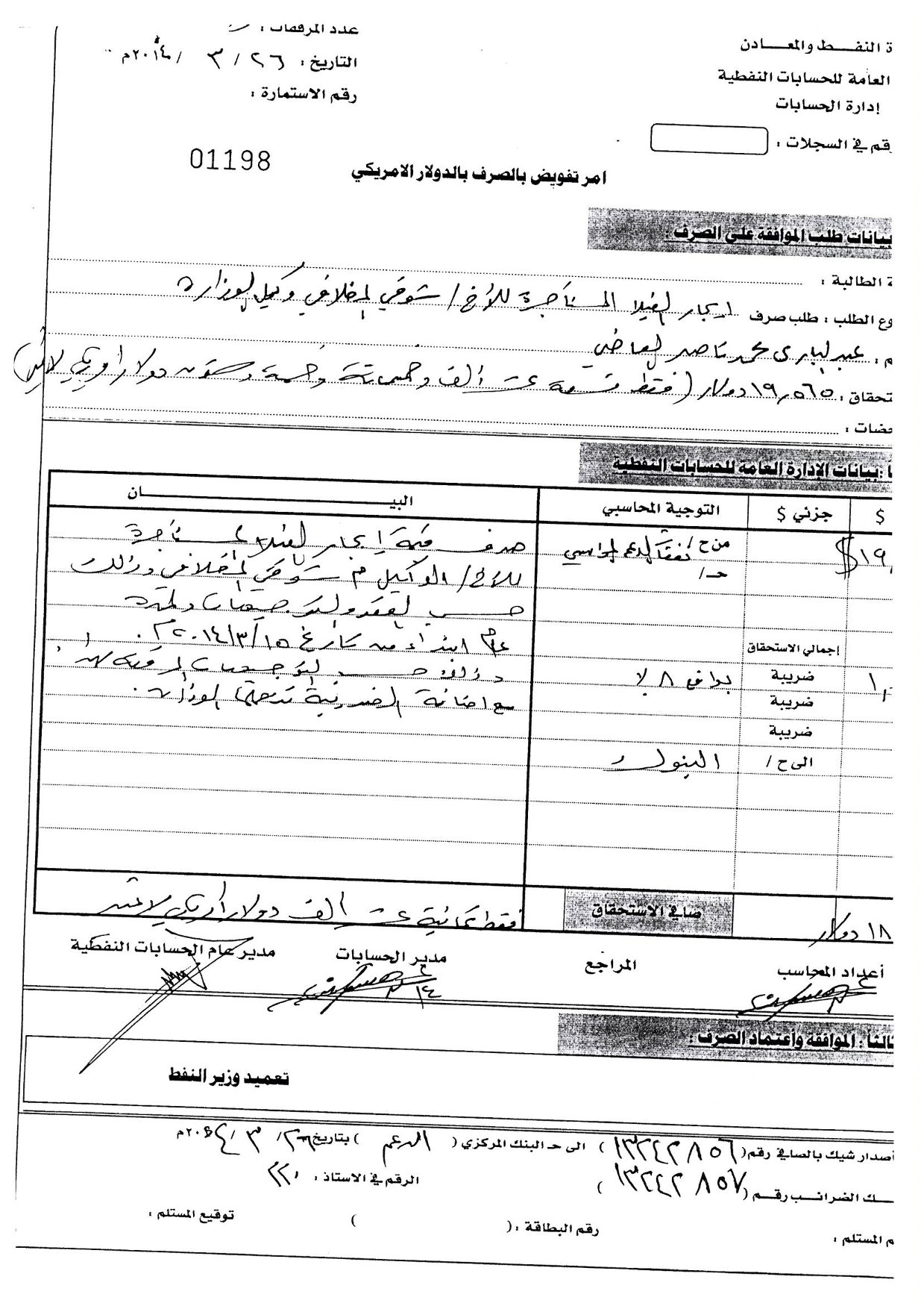 1. أمر صرف مبلغ 50.184 دولارلقيادة الوزارة مع قائمة من الموظفين مقابل متابعة توريد فوارق أسعار الديزل من شركة توتال خلال النصف الأخير من عام 2013م.