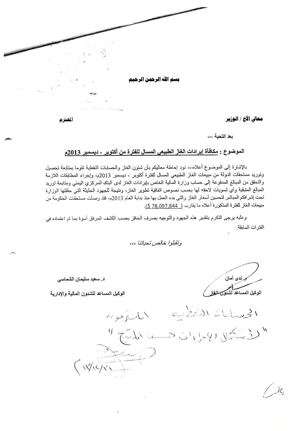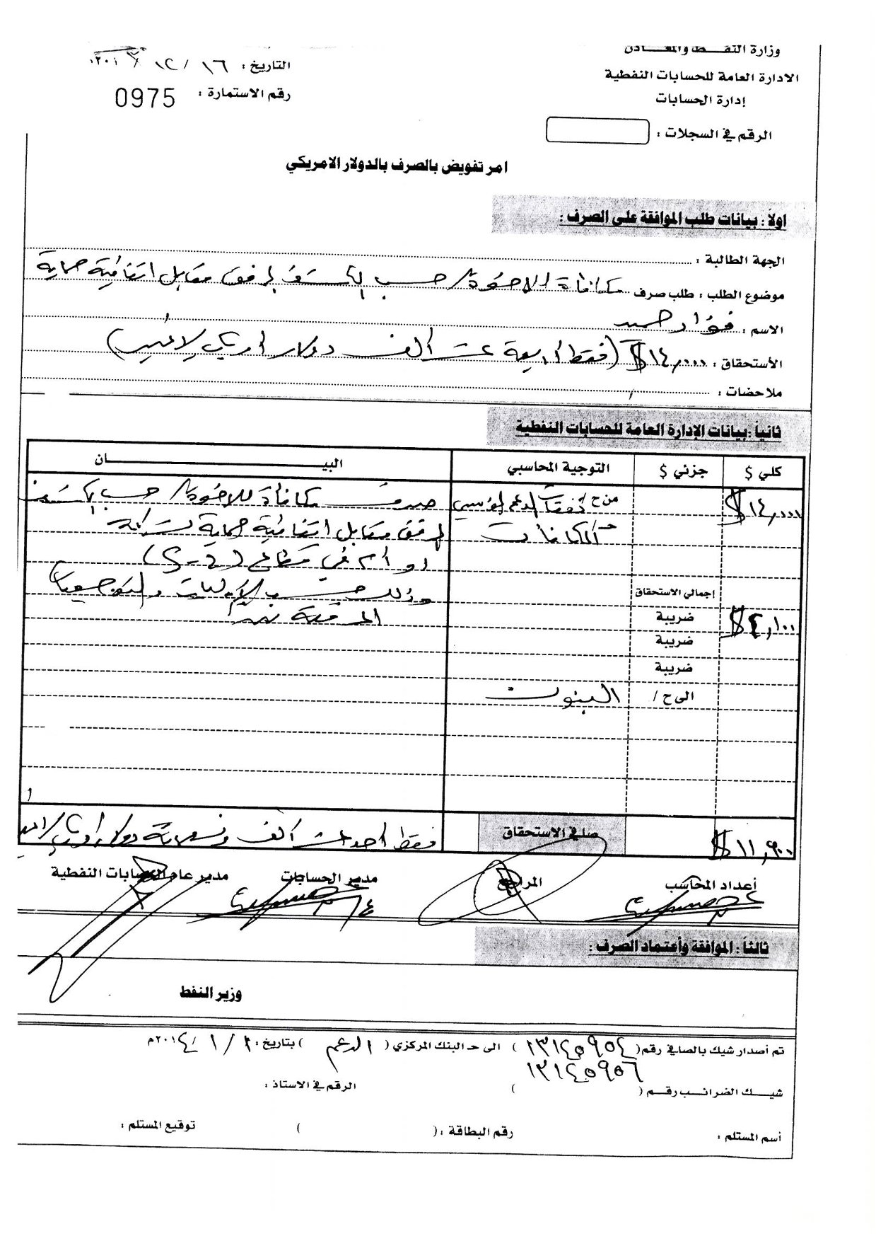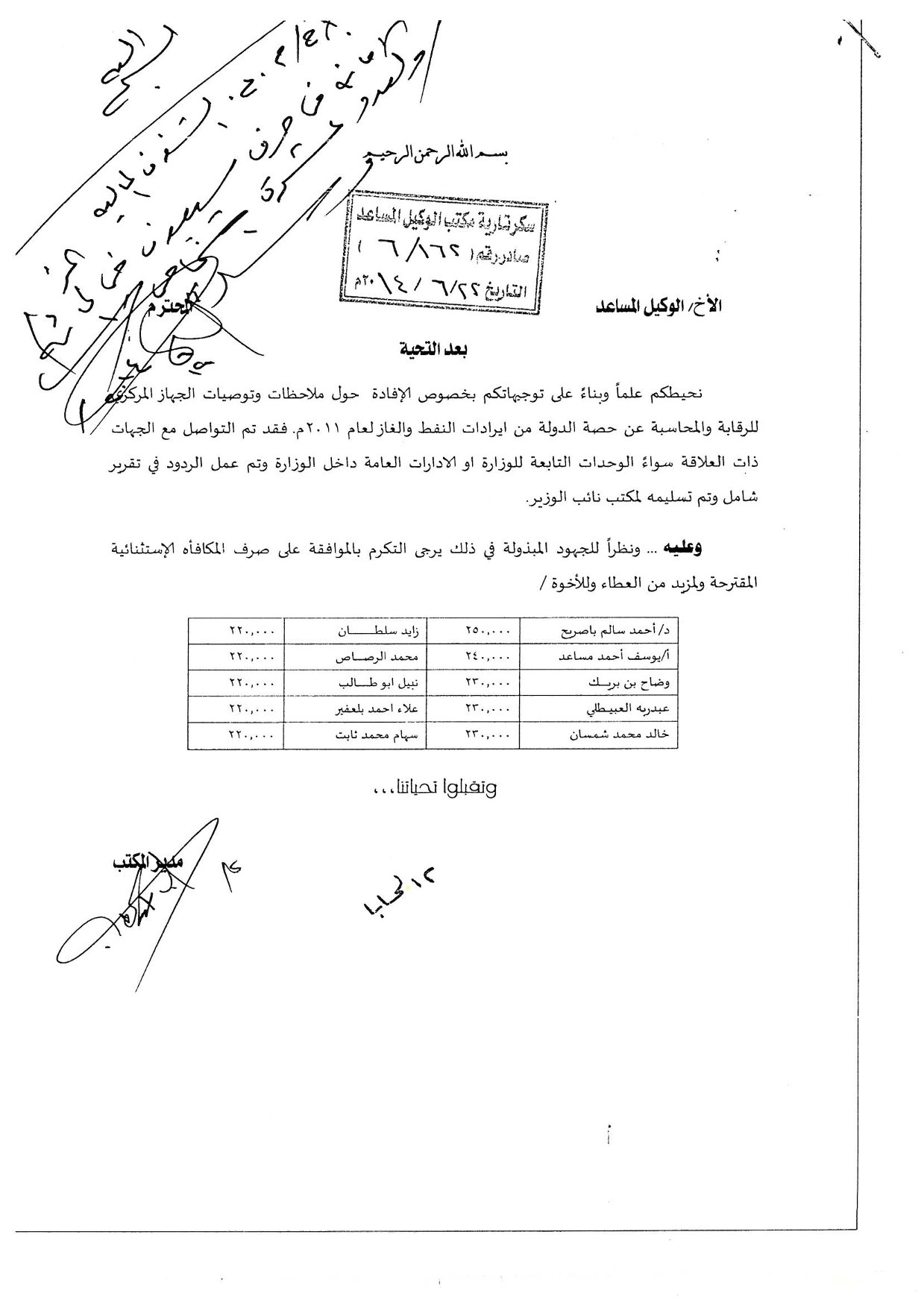 1. أمر صرف مبلغ 113.750 دولار لدفع مكافآت مقابل متابعة مستحقات الدولة من مبيعات الغاز.