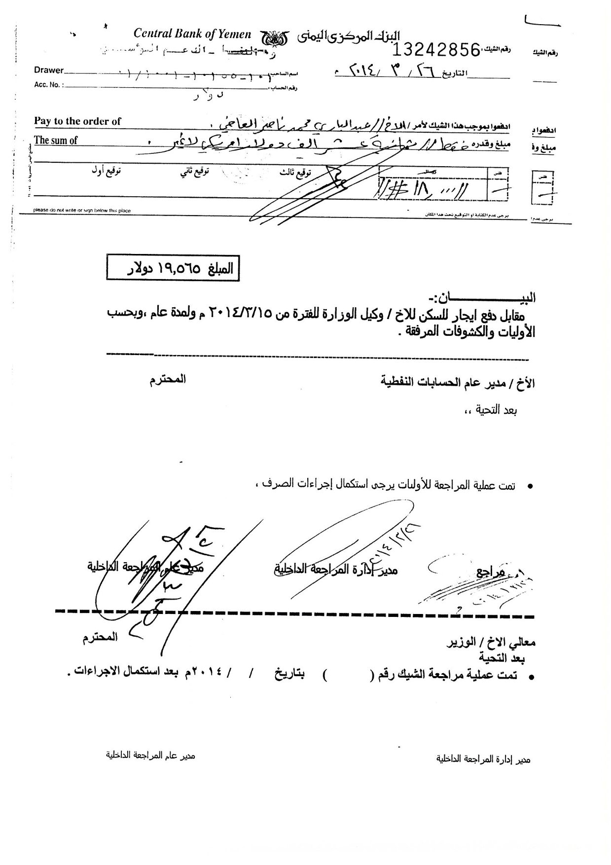 1. أمر بصرف مبلغ 27.500 دولار لدفع ايجار عام واحد لسكن نائب وزير النفط أحمد باصريح