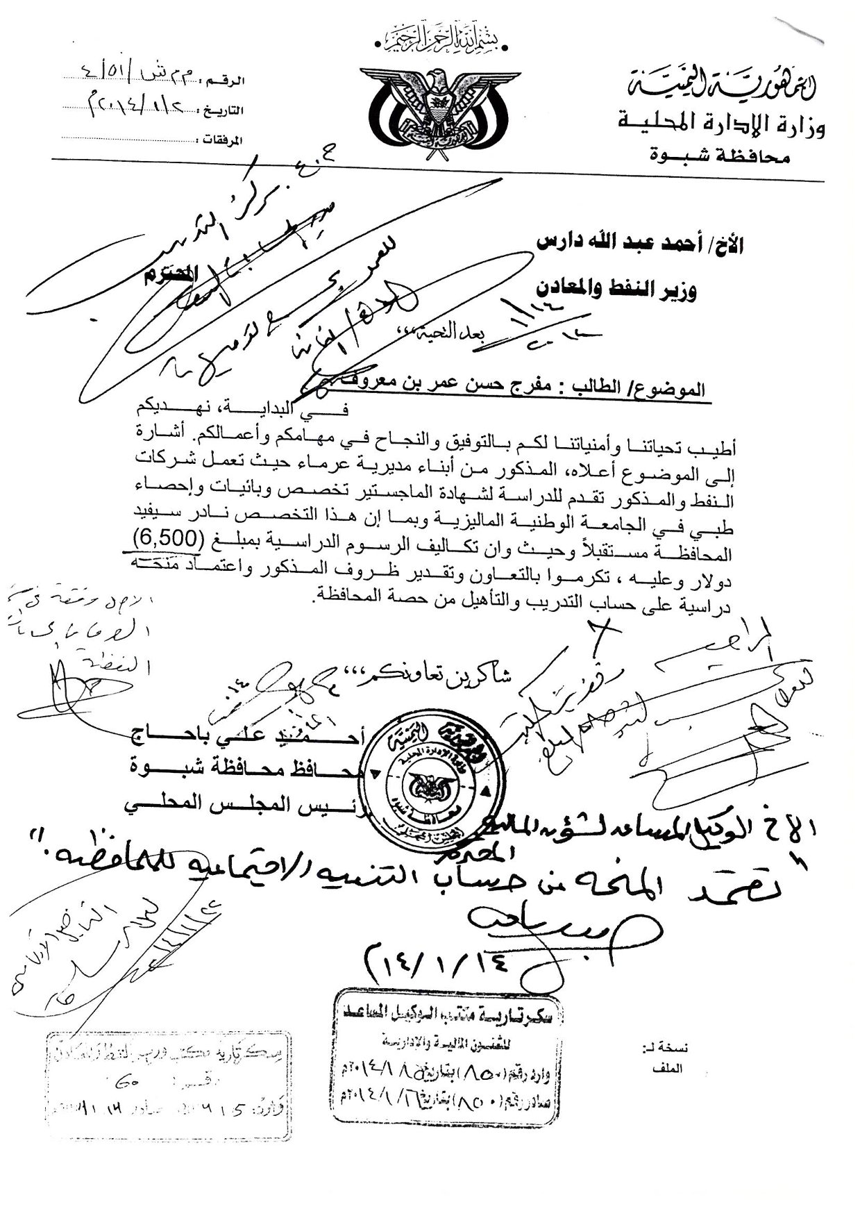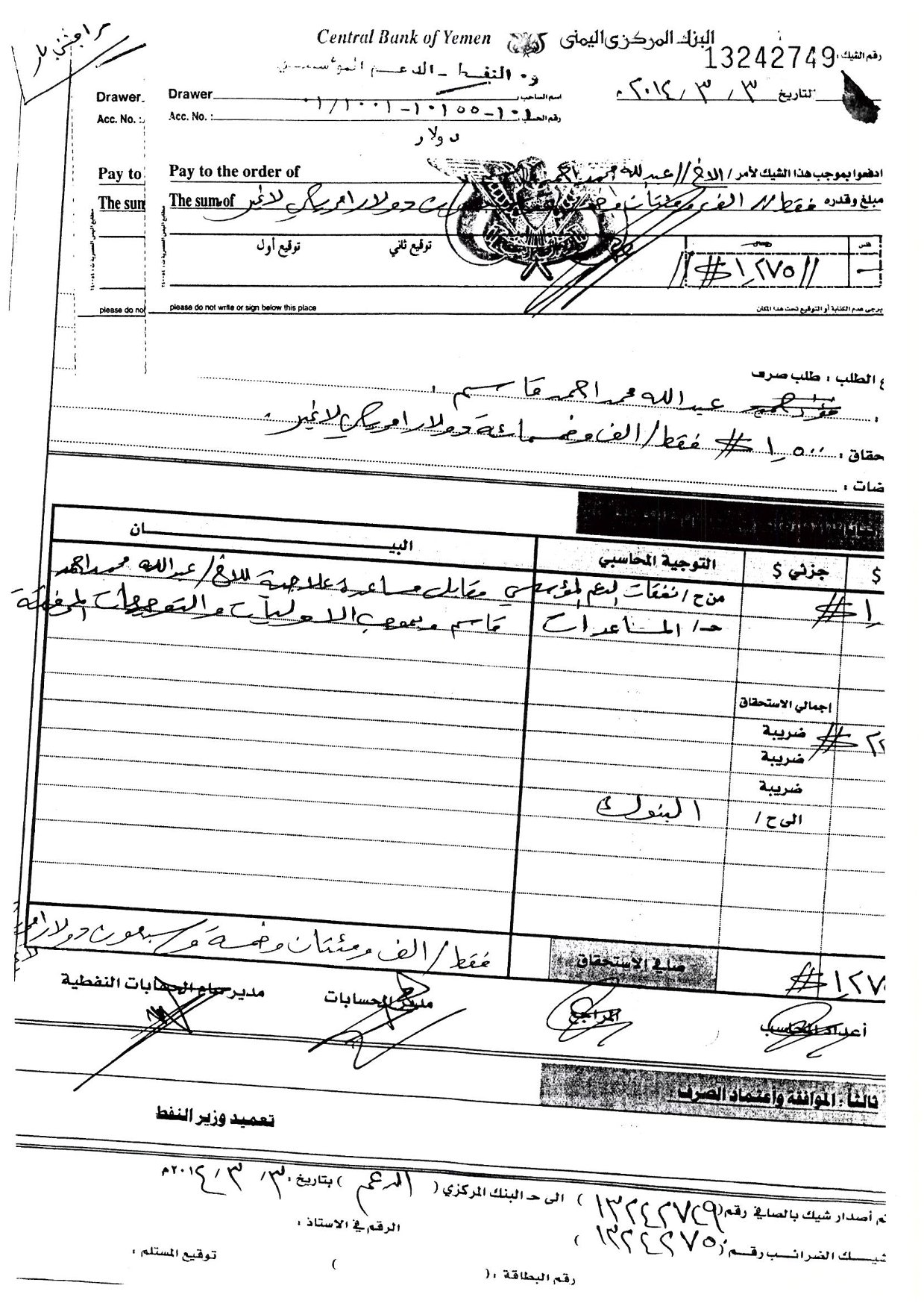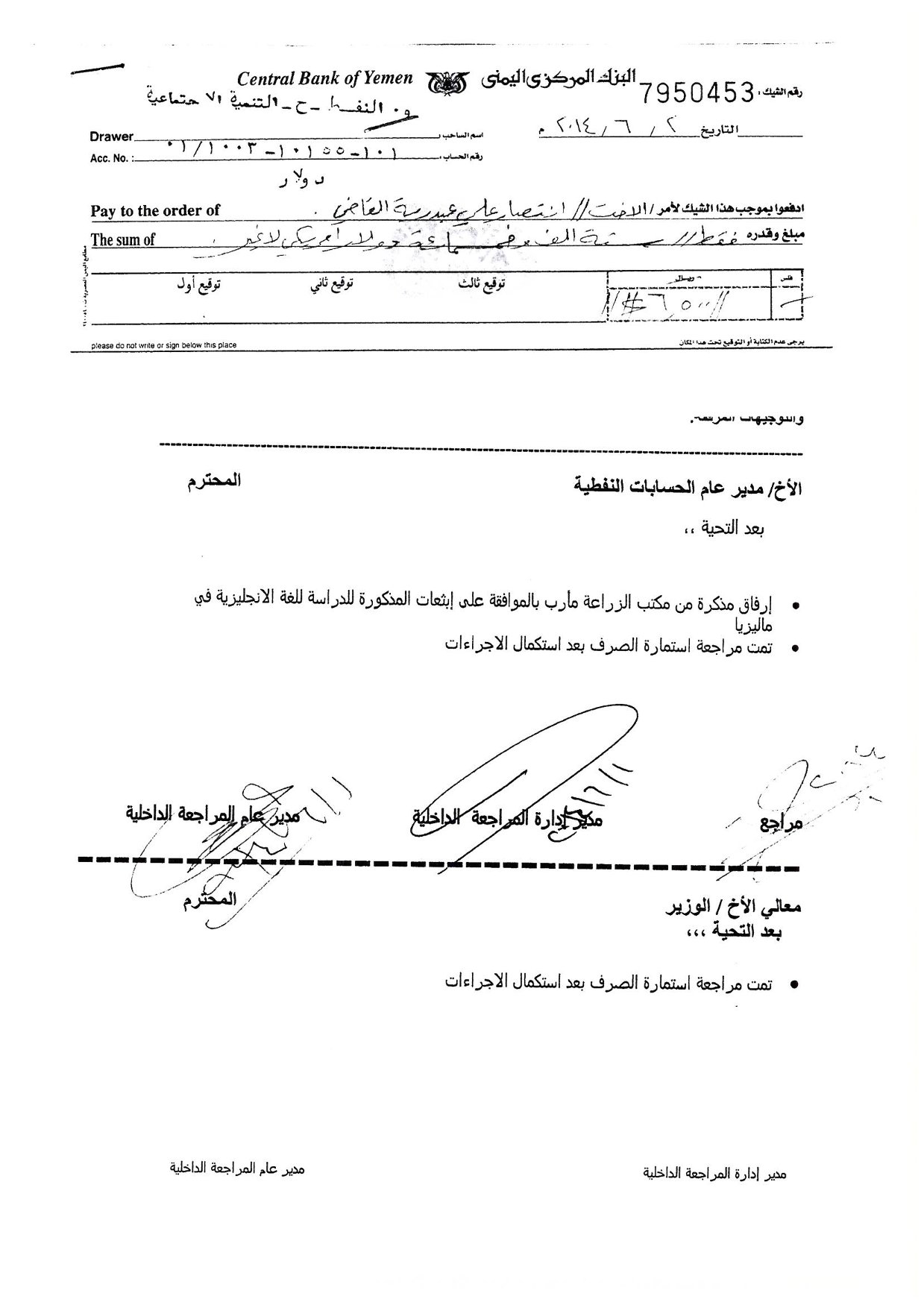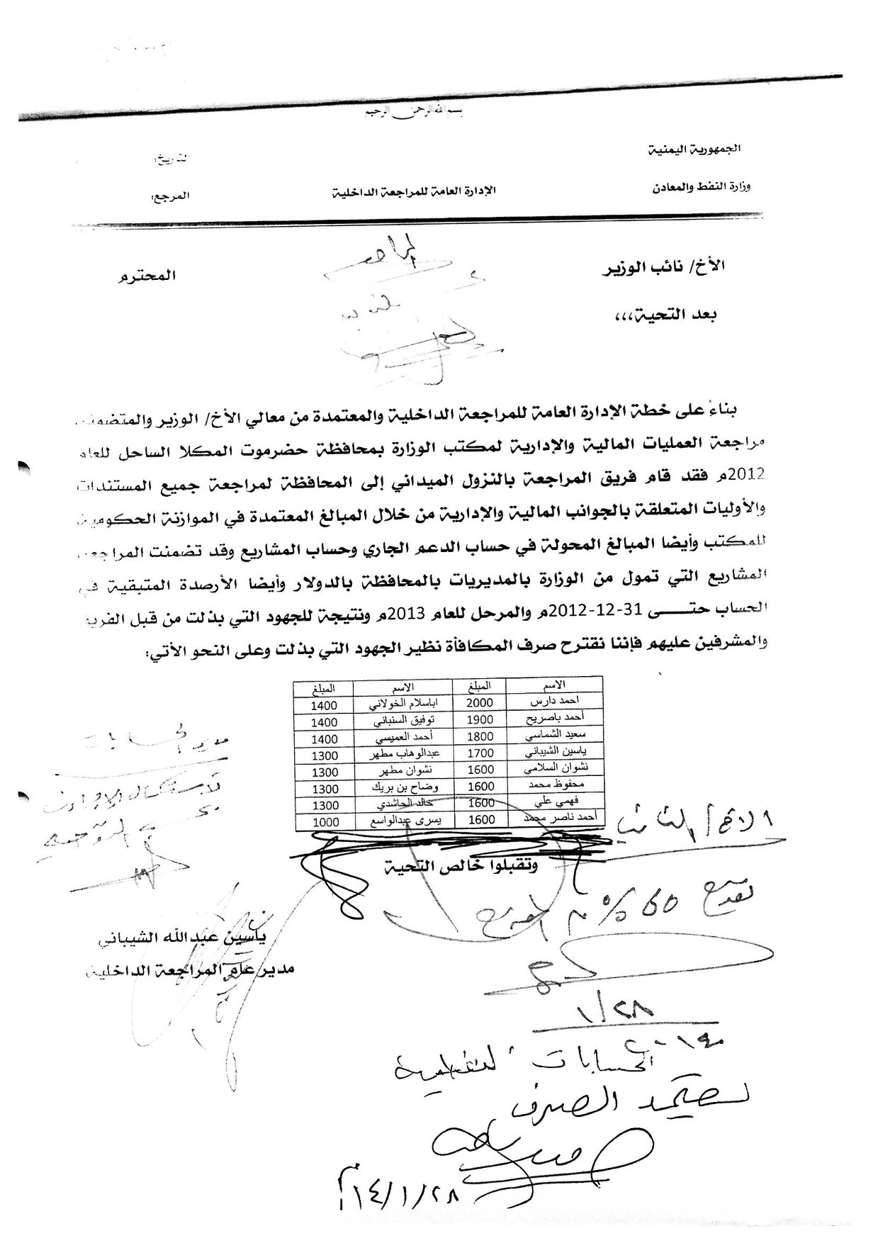 1. أمرف بصرف مبلغ 14.520 دولار لقيادة الوزارة وعدد من الموظفين مقابل مراجعة العمليات المالية لمكتب النفط في حضرموت.