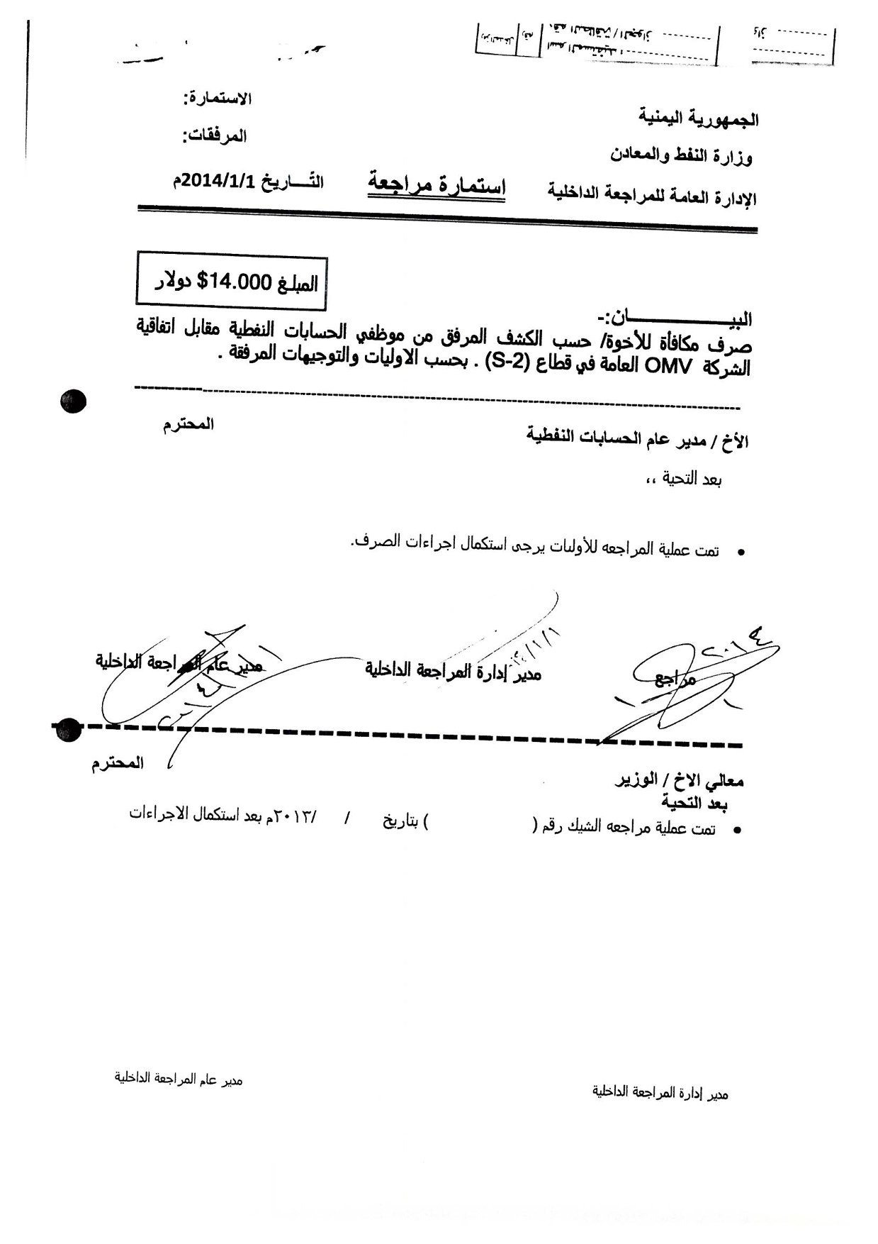 1. أمر إلى شركة (OMV) المشغلة لقطاع (S2) بصرف مبلغ 14.000 دولار مكافآت لقيادة الوزارة وإدارة الحسابات النفطية مقابل مراجعة اتفاقية الحماية الأمنية الخاصة بالقطاع.