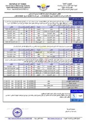 المناطق الساحلية :- طقس غائم جزئياً مع احتمال هطول أمطار متفرقة على أجزاء من السواحل الغربية والشرقية والمناطق الداخلية المقابلة وارخبيل سقطرى، الرياح نشطه على جنوب الساحل الغربي وحول أرخبيل سقطرى والسواحل الشرقية وأقصى سرعة لها 25 عقدة.
