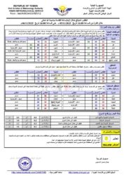 المرتفعات الجبلية :- طقس صحو وبارد إلى شديد البرودة خلال ساعات الليل والصباح الباكرعلى محافظات (ذمار، البيضاء، صنعاء، عمران، غرب الجوف وصعده) حيث تتراوح درجات الحرارة من (1- 5 درجة مئوية)، وبارد أجمالا على مرتفعات (تعز، إب، المحويت، مأرب, حضرموت، شبوه، الضالع، لحج وأبين) حيث تتراوح درجات الحرارة من (6- 10 درجة مئوية) مع إحتمال تشكل قطع من السحب الركامية عليها خلال فترة مابعد الظهر.