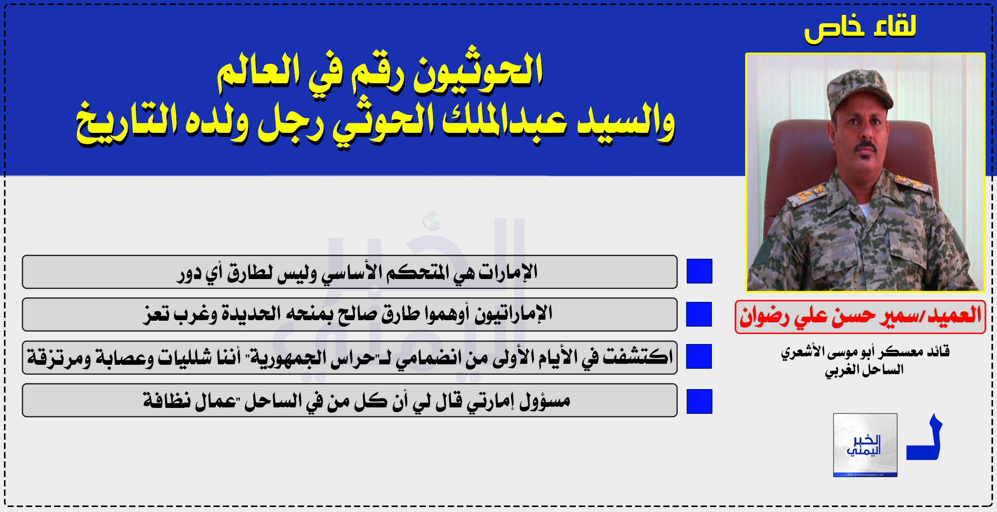 وأشار العميد سمير رضوان الذي أعلن انشقاقه وعودته إلى العاصمة صنعاء في حديث خاص لـ”الخبر اليمني” إلى أن الإماراتيين أوهموا طارق صالح بمنحه السيطرة على محافظة الحديدة والمديريات الغربية لمحافظة تعز.