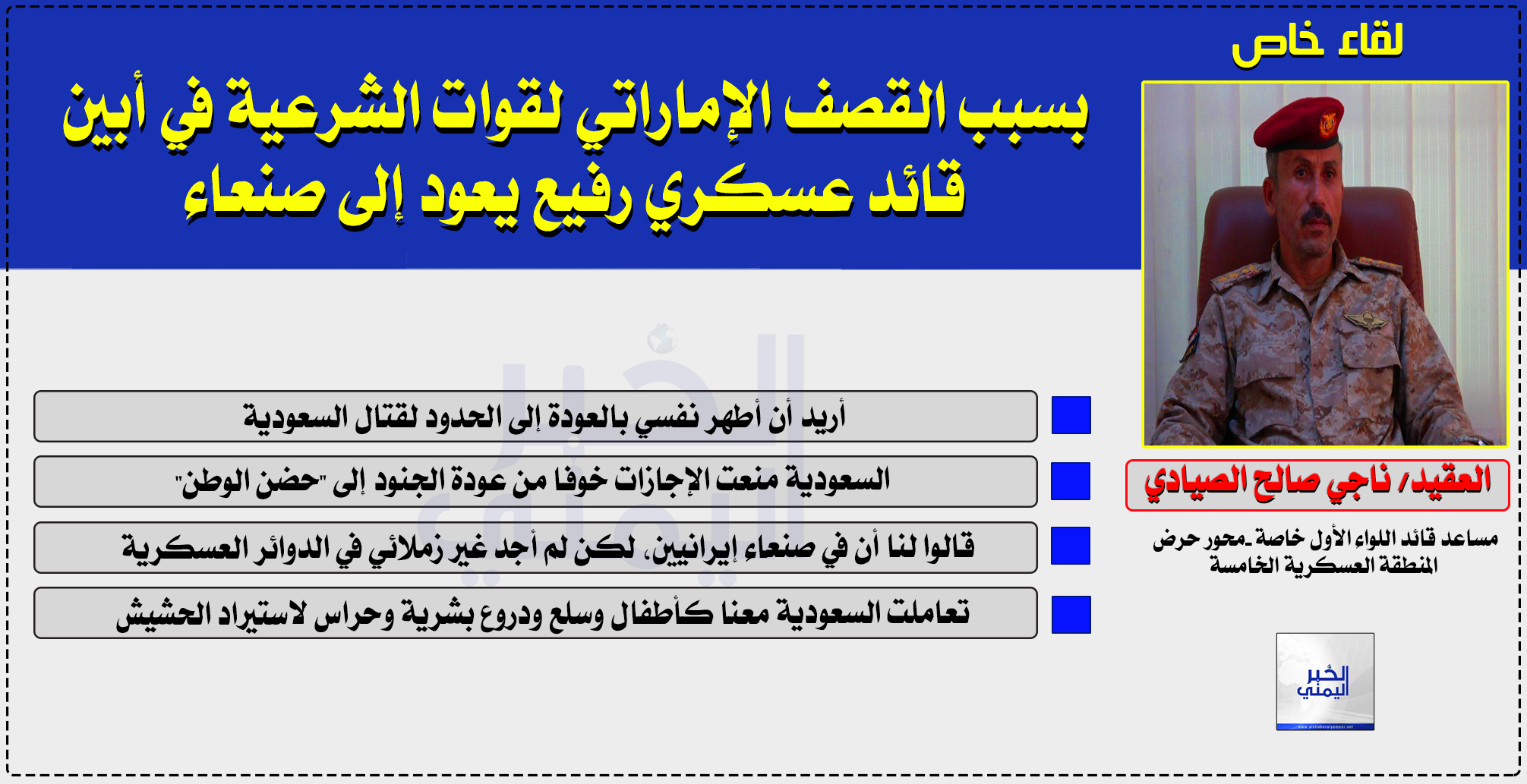 وبيّن العقيد الصيادي الذي أعلن انشقاقه عن الشرعية وعودته إلى صنعاء في لقاء خاص مع موقع “الخبر اليمني” أن السعودية لا تهدف إلا إلى تدمير اليمن واقتتال أبناءها، ولا صحة لوجود شيء اسمه الشرعية، فالسعوديون هم المتحكم الأول والأخير بالقرار العسكري، وهم من يعطون التوجيهات للقيادات العسكرية.